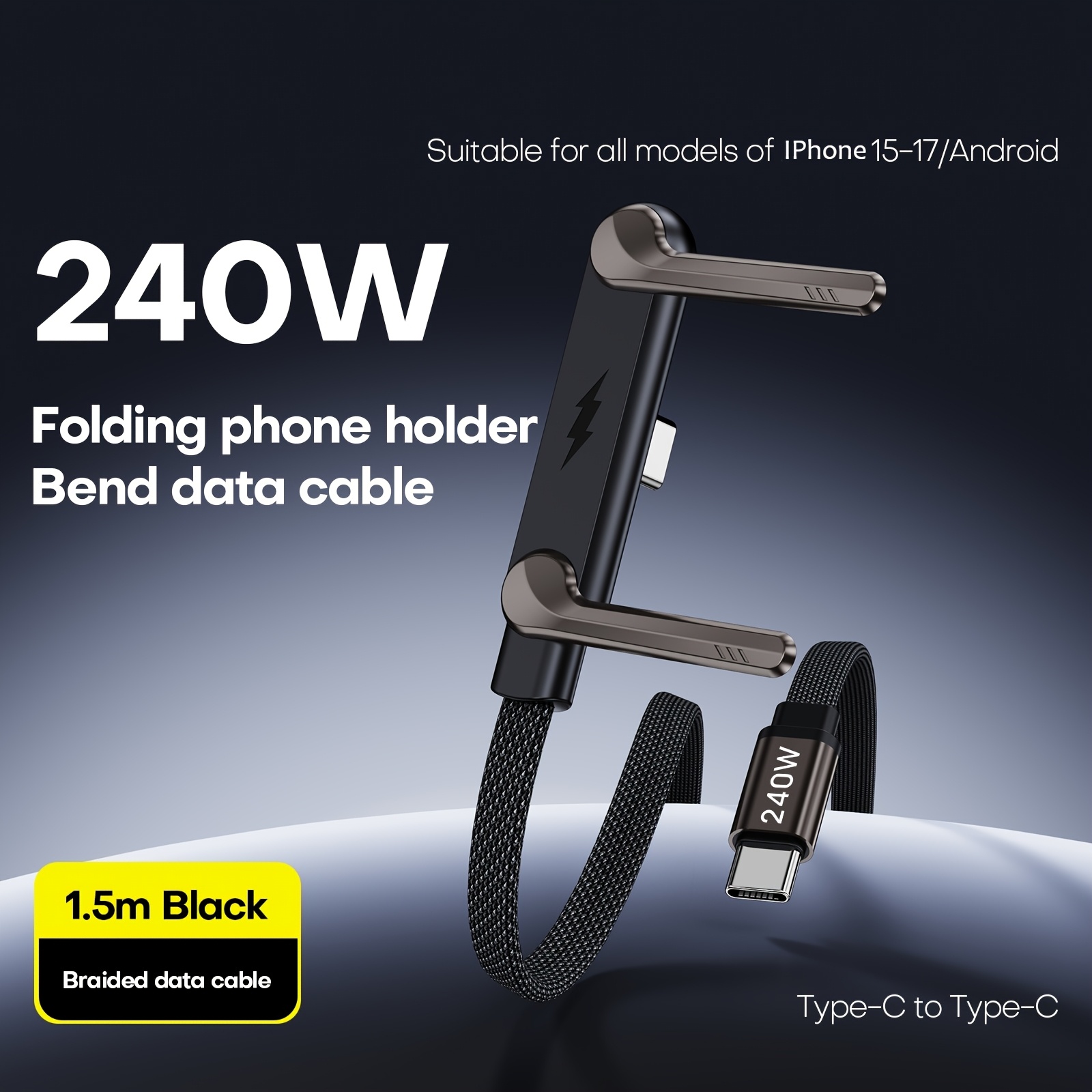 Invisible Charging Cable with Bracket, Type-C to Type-C, 240W PD Fast Charging Cable, 360-Degree Rotatable Adjustable Metal Bracket, Fully Compatible with Mobile Phone Charging Cables