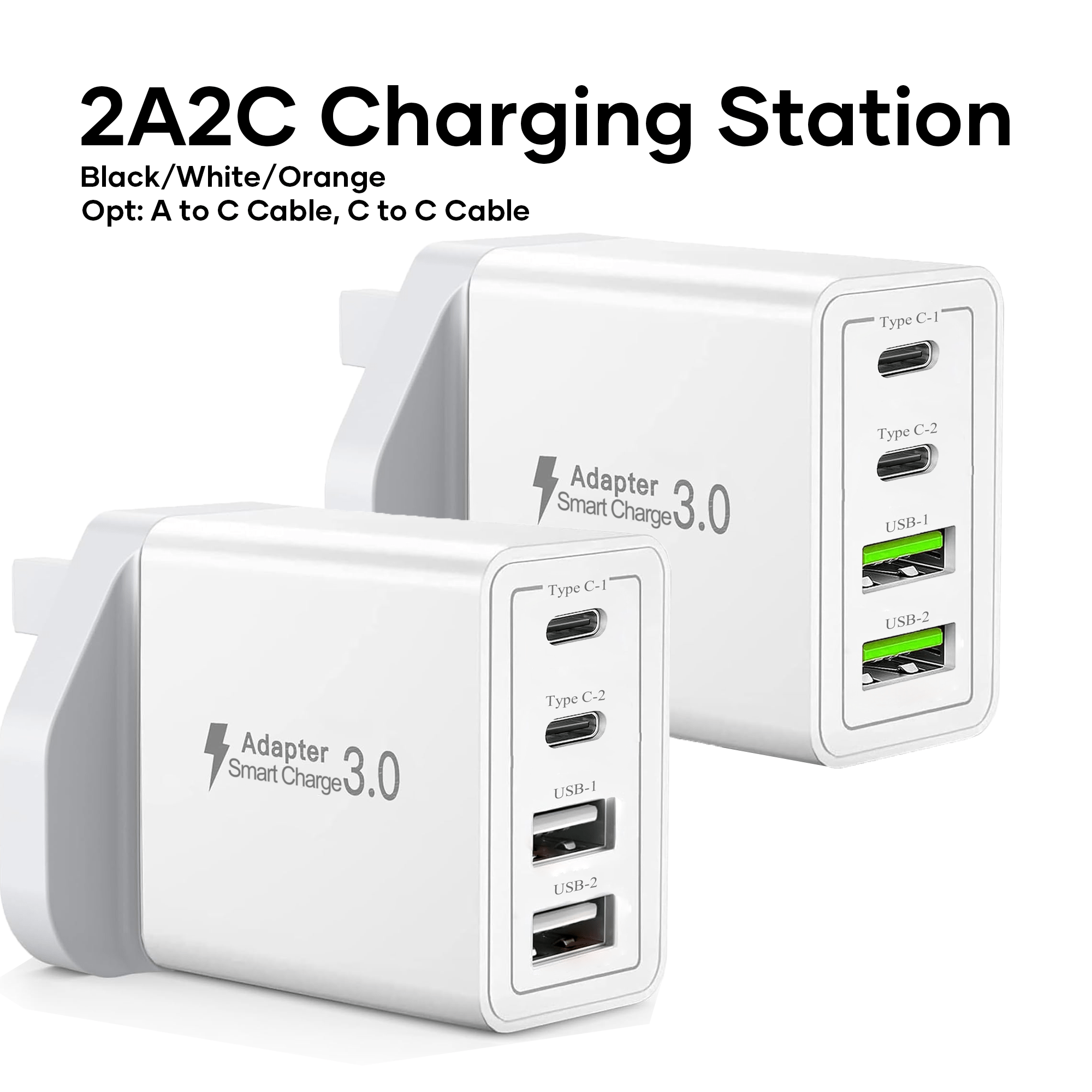 4-Port USB Charger with British Plug, Featuring 2A2C Fast Charging Capabilities, Suitable for Iphones, Android Devices, Phone Cameras, MP3 Players, And More.
